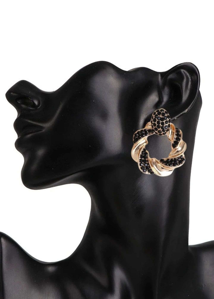 “Striking Black and Gold Rhinestone Dangle Earrings: Round statement dangle earrings adorned with dazzling rhinestones. A glamorous choice for women in Pakistan, trending in 2025 for parties and special occasions.”