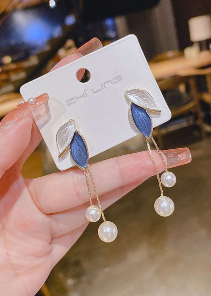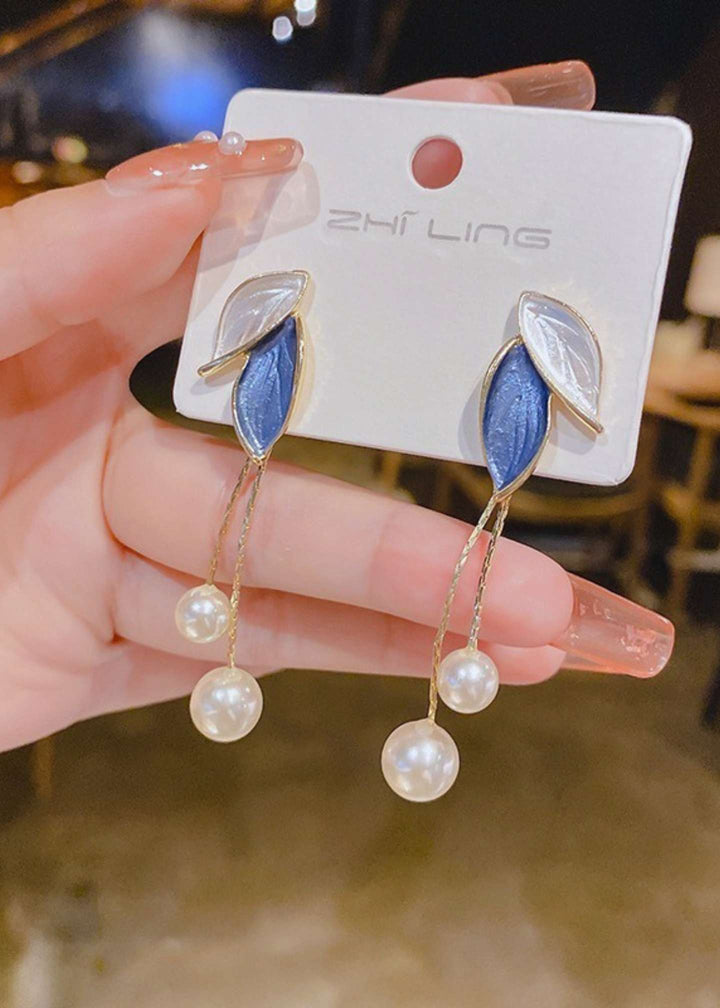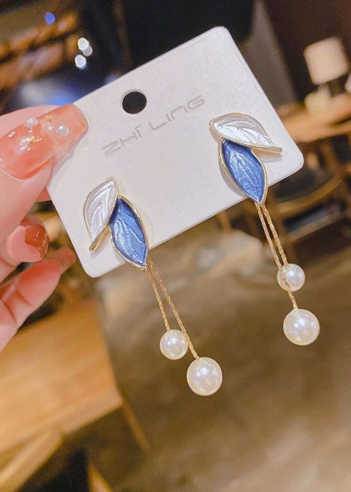 βElegant Blue and White Leaf Pearl Tassel Earrings: Featuring a chic leaf design with dangling pearls, these tassel earrings offer a sophisticated touch. Discover these best earrings for women 2025 online in Pakistan.β