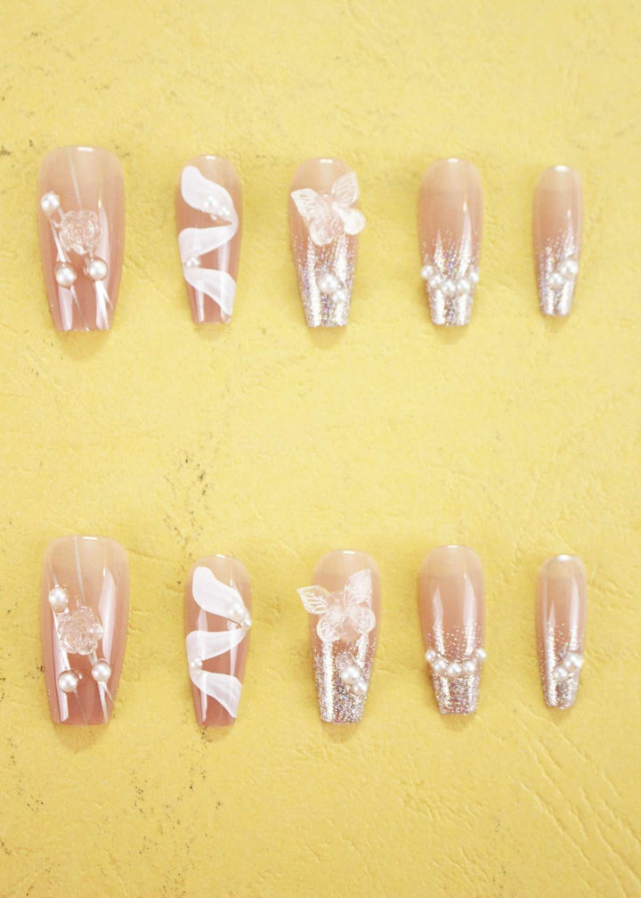 "Embrace ethereal beauty with our Dreamy Pearl Garden Sheer Nails. This 30-pcs set features a translucent base adorned with delicate pearls and floral hints, creating a soft, romantic look. Perfect for a subtle yet incredibly chic and sophisticated manicure. Visit Pablo Mode to shop, delivery guaranteed throughout Pakistan."
