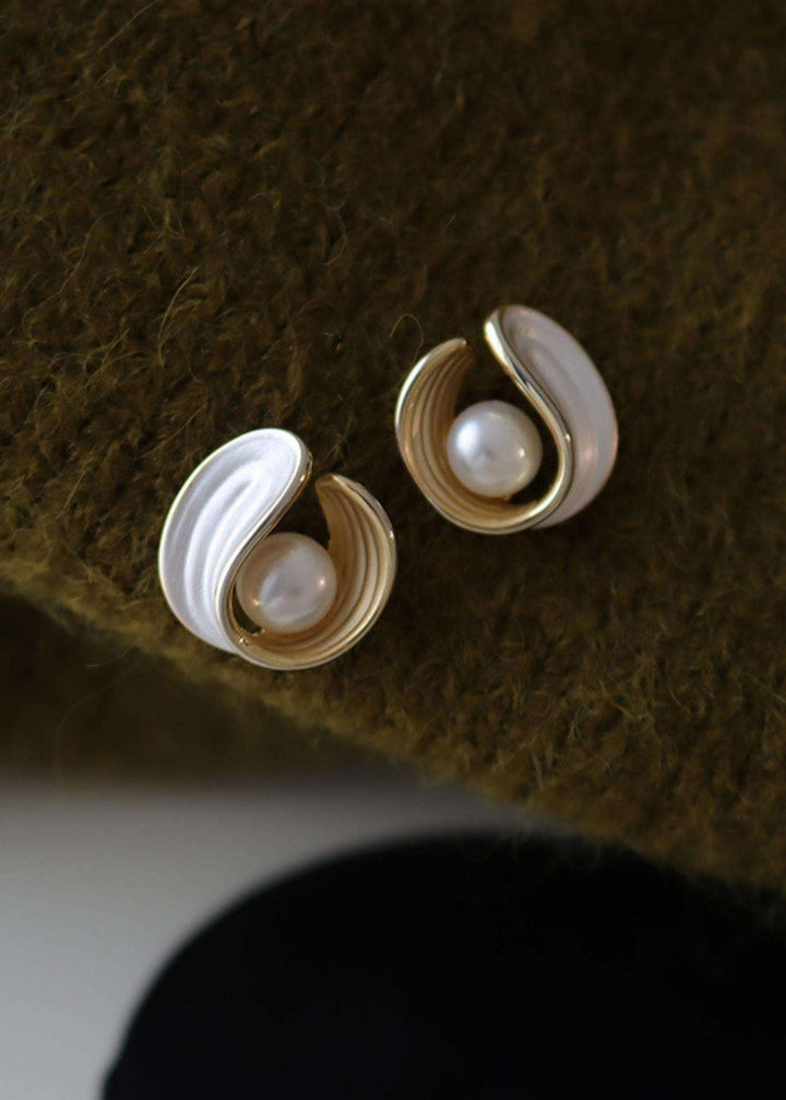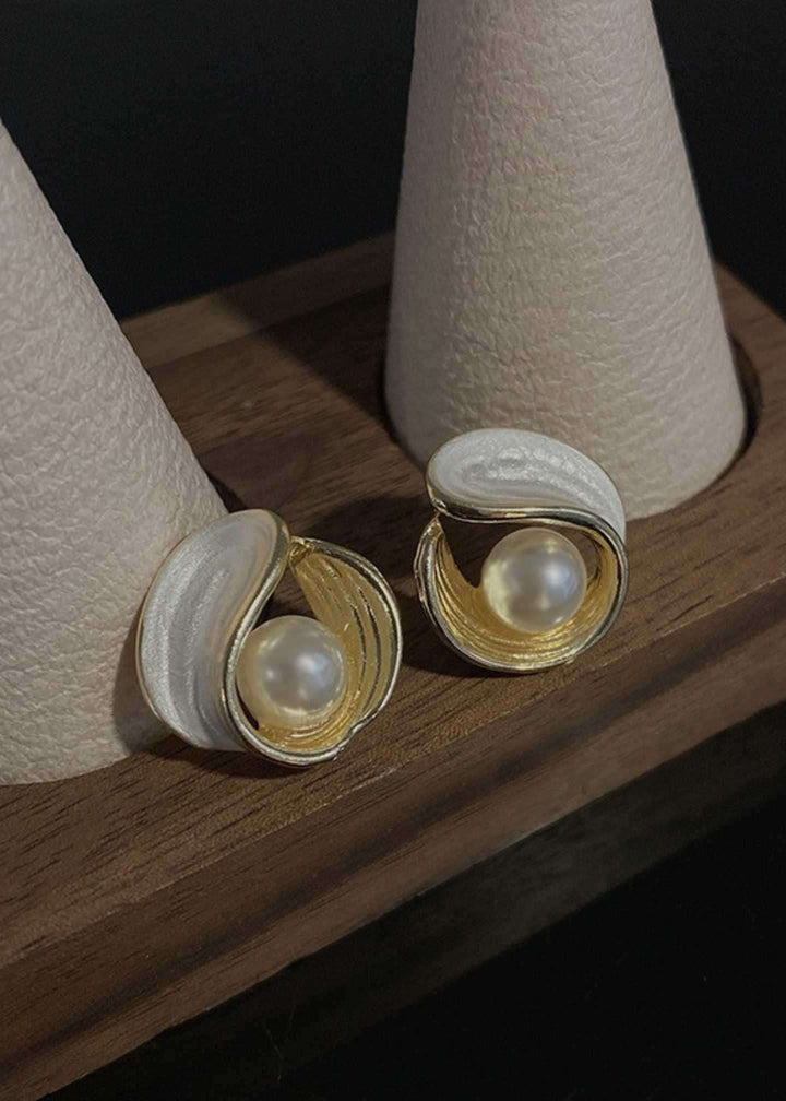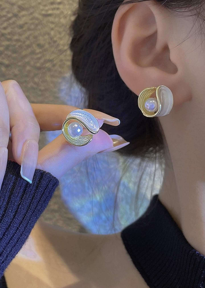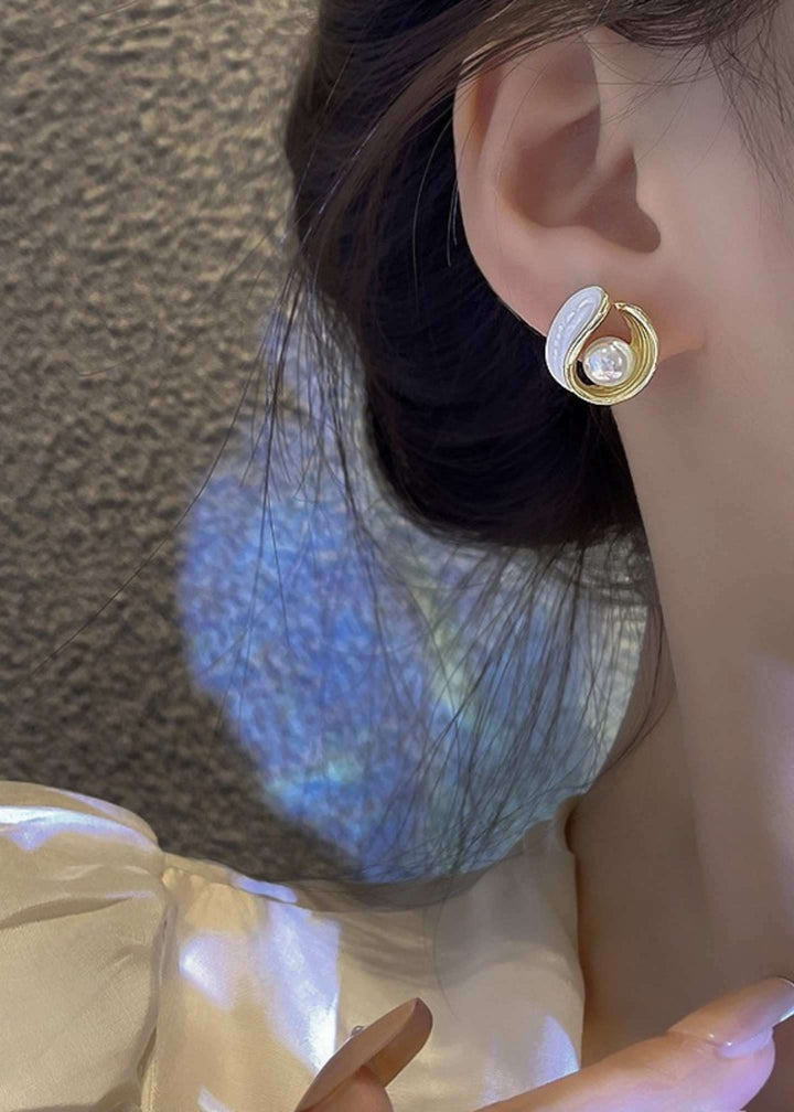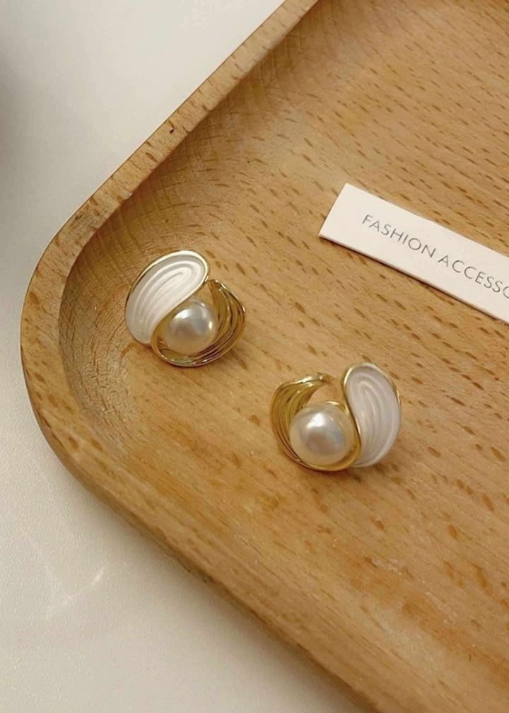 “Charming Korean Shell Pearl Stud Earrings: A cute gold design cradles a delicate pearl within a stylish shell. A perfect blend of trendy and classic, available online in Pakistan for girls seeking exclusive new arrivals.”
