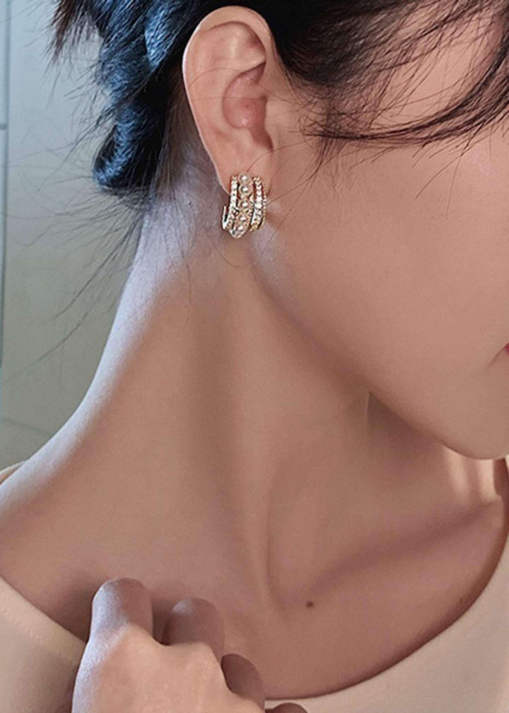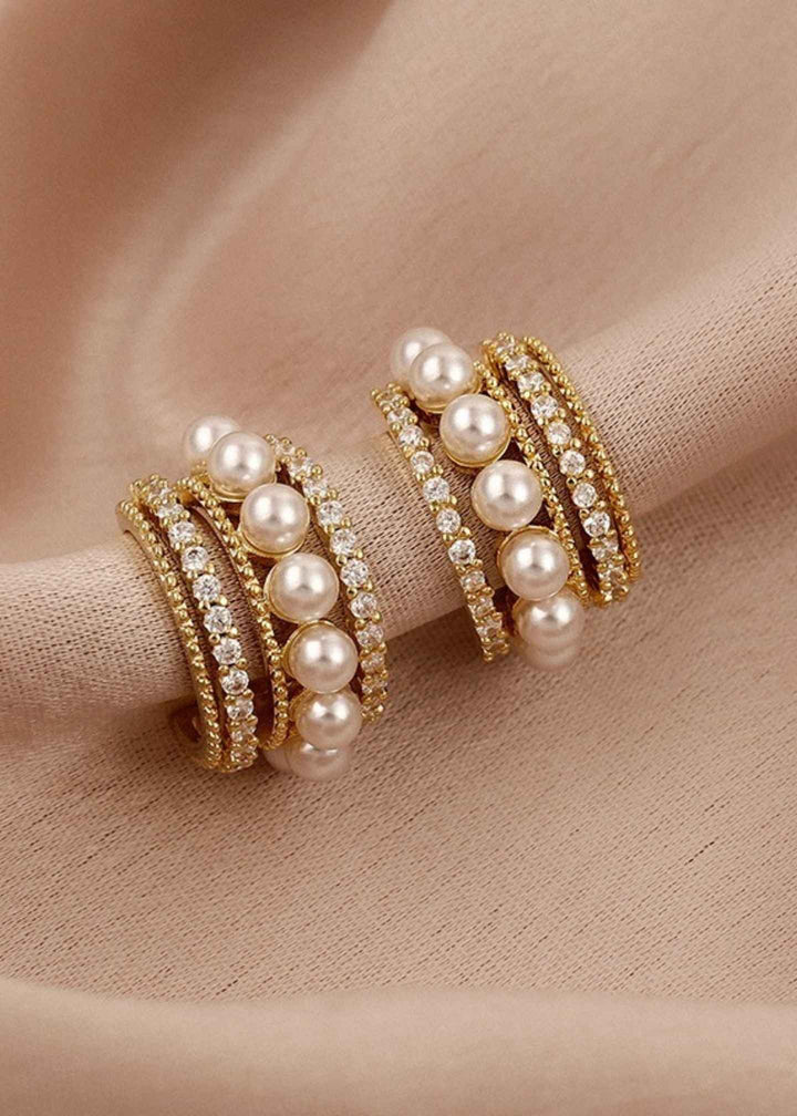 “Fresh Gold Pearl CZ Hoop Earrings: Gold plated C-shaped earrings with a Korean retro flair. Discover new gold hoops online in Pakistan, a trendy 2025 jewelry essential.”