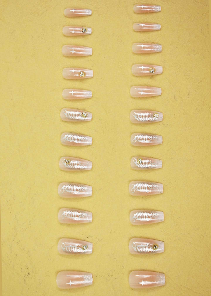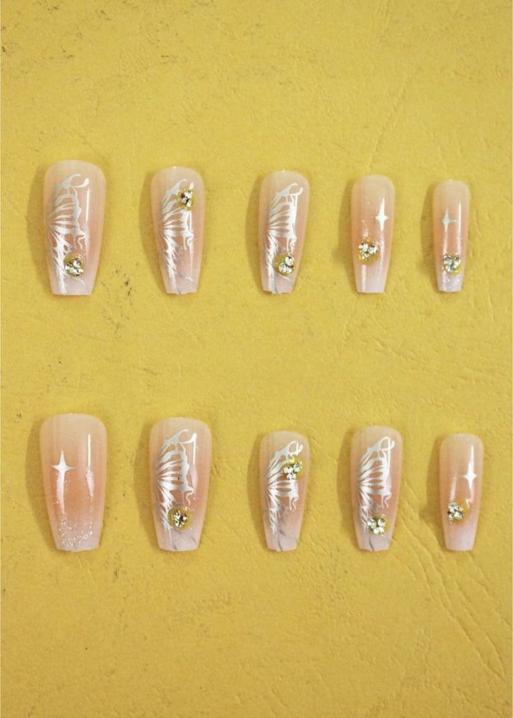 "Achieve a flawless, heavenly manicure with our Nude Ombre Wings Press-Ons. This 24-pcs set combines a soft nude ombre gradient with delicate wing accents for a subtle yet stunning effect. It's the ideal choice for an elegant, everyday look or a special event. The Pablo Mode collection, deliverable everywhere in Pakistan."