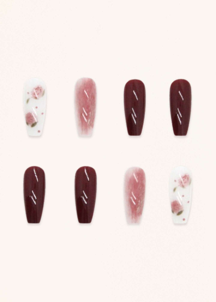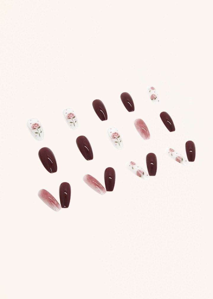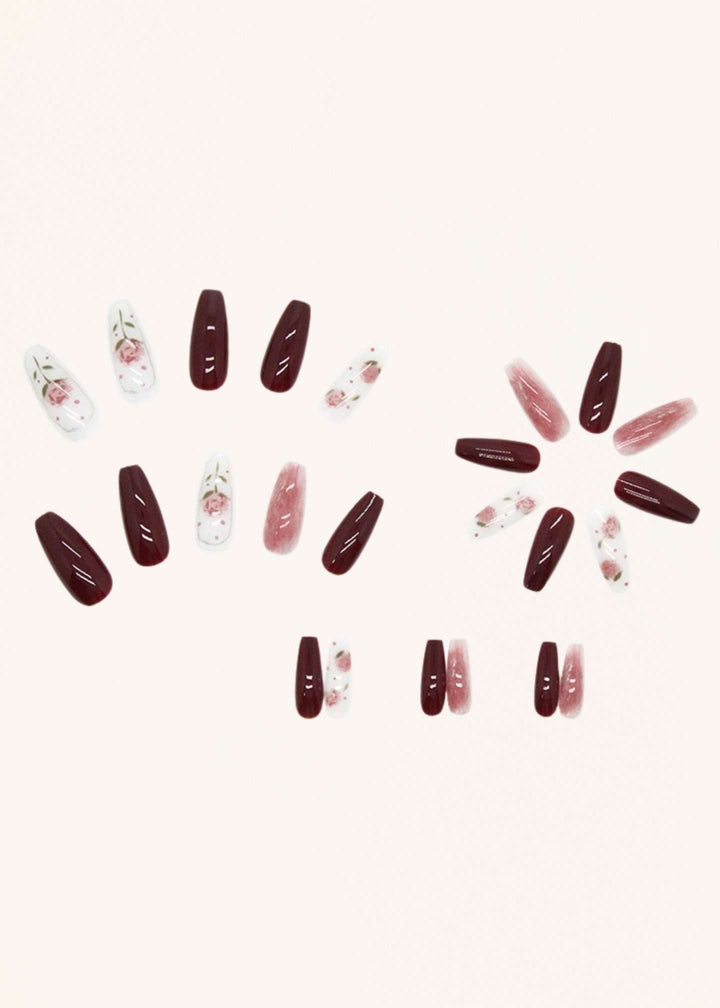 Discover the allure of deep Oxblood Red Floral False Nails in a chic long coffin shape with this easy-to-apply 24-piece set, available now at Pablo Mode PK. Command attention with this bold and beautiful design. A deep, rich oxblood red base provides a dramatic canvas for delicate, contrasting floral artwork. This set combines passionate color with artistic detail for a powerful and sophisticated manicure that displays confidence and style.