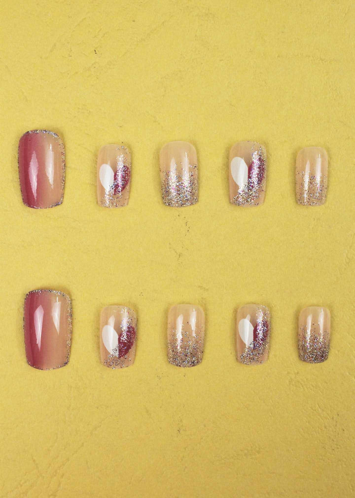 "Wear your heart on your nails with our Pink Heart Hue Gleam Press-Ons. This adorable set features a lovely pink sheen with cute heart details. It's the perfect way to add a touch of sweetness and romance to your everyday style."