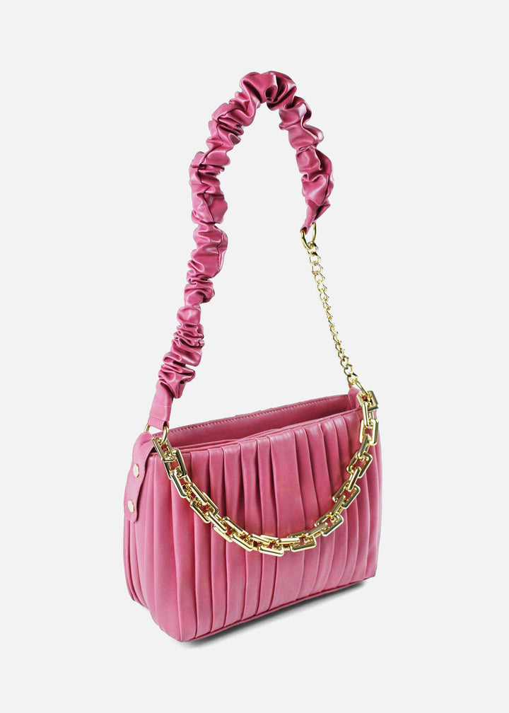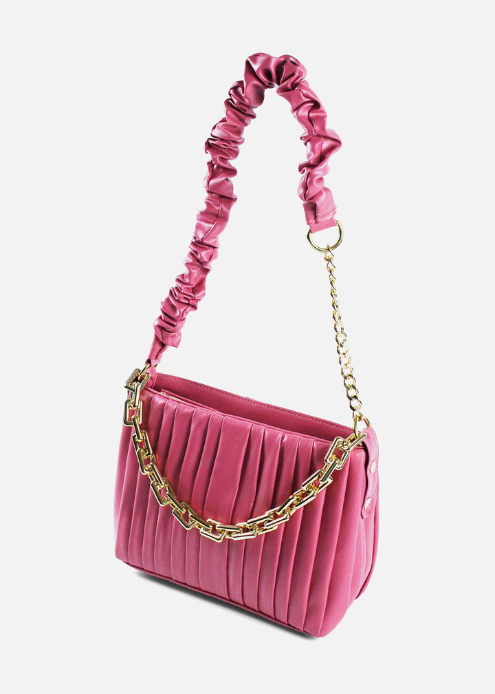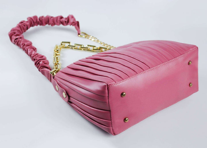 “Chic Berry Pink Ruched Shoulder Bag with gold chain, perfect for adding a touch of glamour to any look, day or night.” |