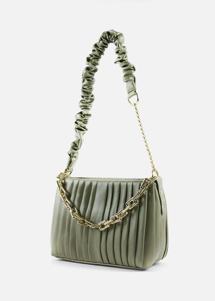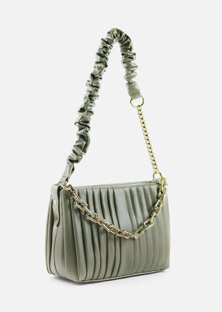 “Dark Khaki-Green Ruched Shoulder Bag with gold chain, perfect for adding a touch of glamour to any look, day or night.” |