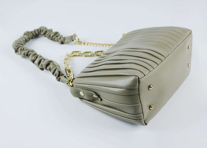 An excellent way to amp up your fashion quotient is to own a part of the Pleated Dark Khaki-Green Shoulder Bag Collection. Heavy gold chain, ruched design, and gold chain strap are all elements that you’ll find in the accessory that’s so perfect for any occasion. For pleated shoulder bags with gold accents for women in Pakistan or a multifunctional dark green shoulder bag with golden chain, this bag combines worlds so easily.