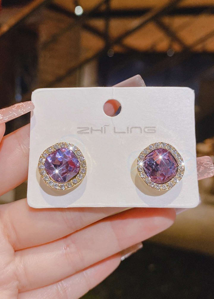 “Radiant purple cubic zirconia halo earrings: Adorn your ears with our new purple gold cubic zirconia halo stud earrings! Featuring dazzling purple crystals surrounded by sparkling halos, these imported, premium studs offer versatile, affordable luxury. Perfect for making a statement at special occasions or adding everyday glam. Imported zircon studs with a golden halo, perfect for adding sparkle to any occasion in Pakistan. Shop these stunning crystal earrings online, Buy now for brilliant sparkle!”