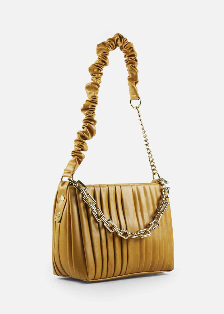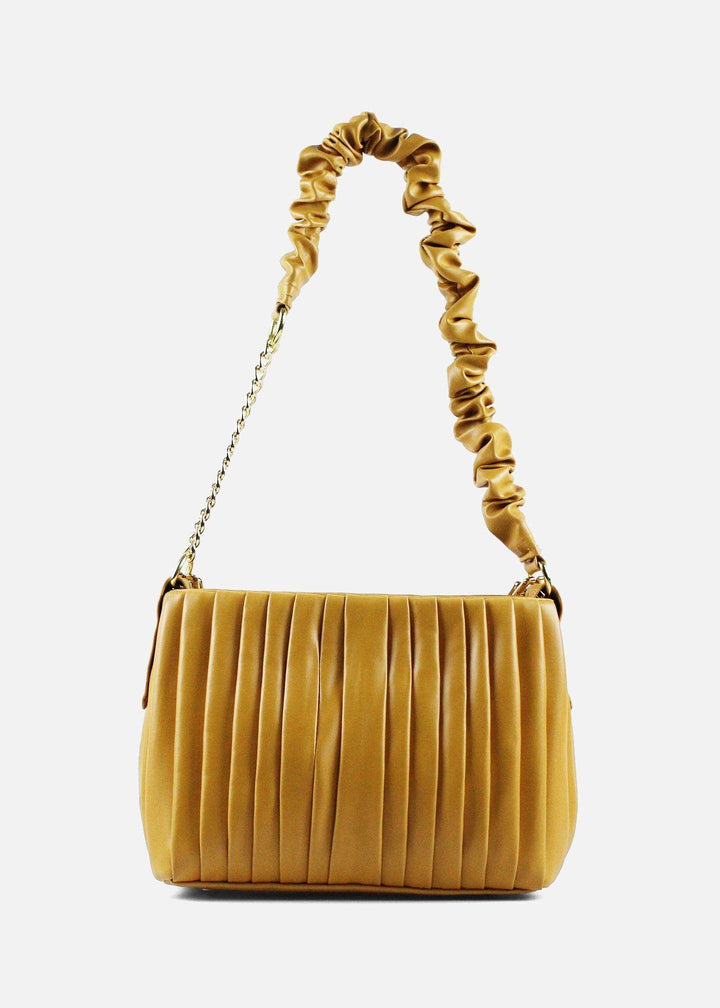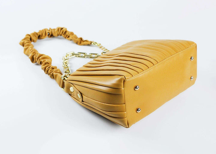 “Saffron yellow shoulder bag with gold chain: Elevate your look with this chic, pleated design. A statement piece for Lahore’s fashion scene.” |