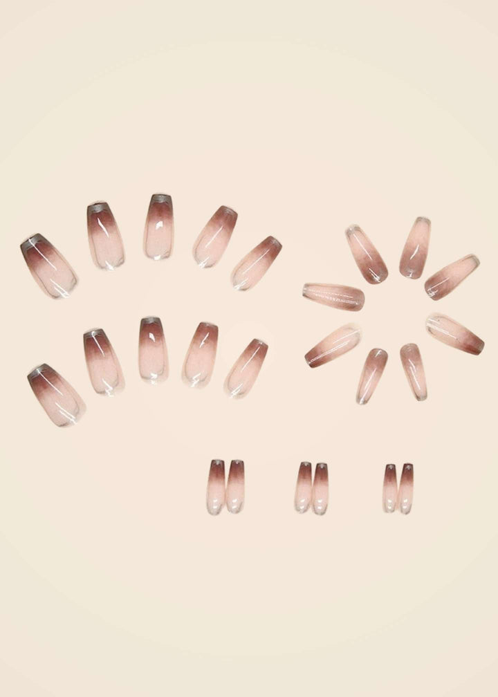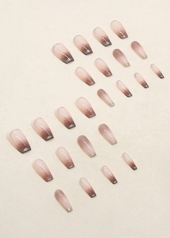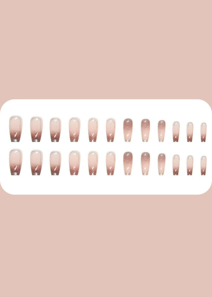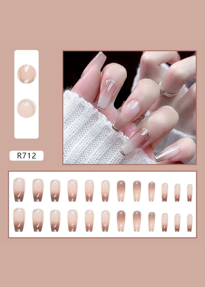 Adorn your fingertips with a refined sheer pink gradient, accented by a chic gold trim and classic French tips on long coffin nails. A 24-piece set exclusively at Pablo Mode PK.