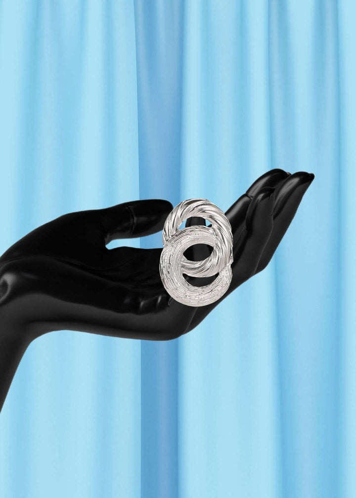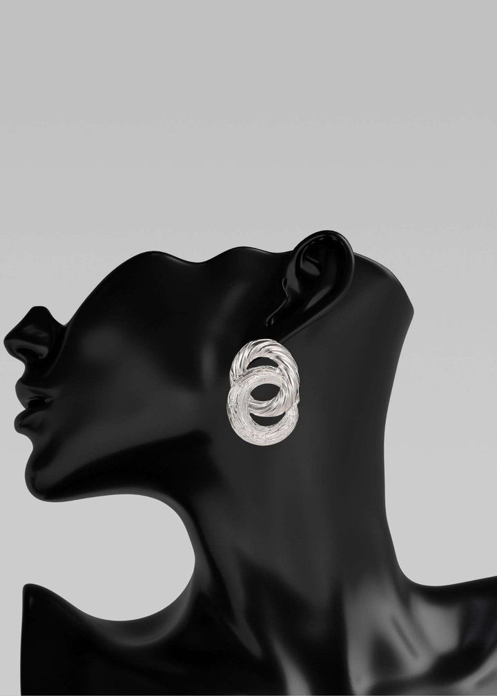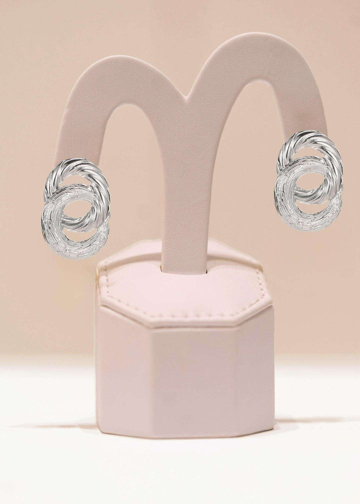 “Modern Silver Intertwined Circle Earrings: Featuring a unique textured design, these round silver statement earrings are a trendy addition to the new arrivals jewelry collection in Pakistan.”