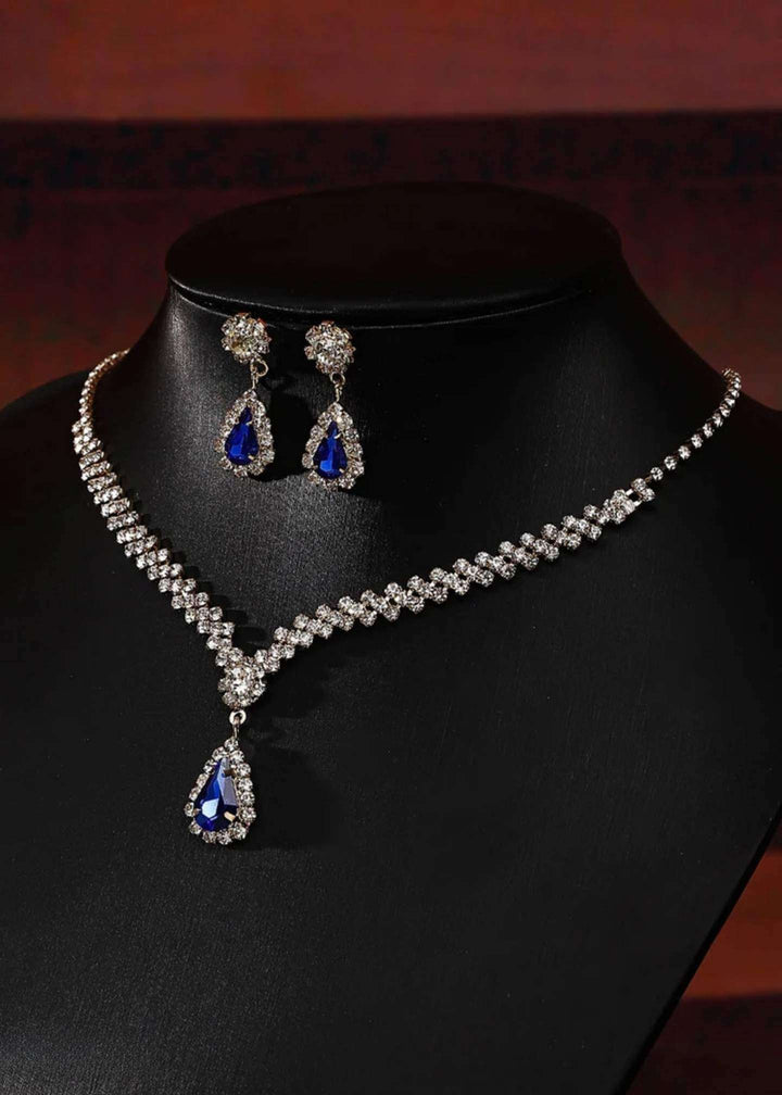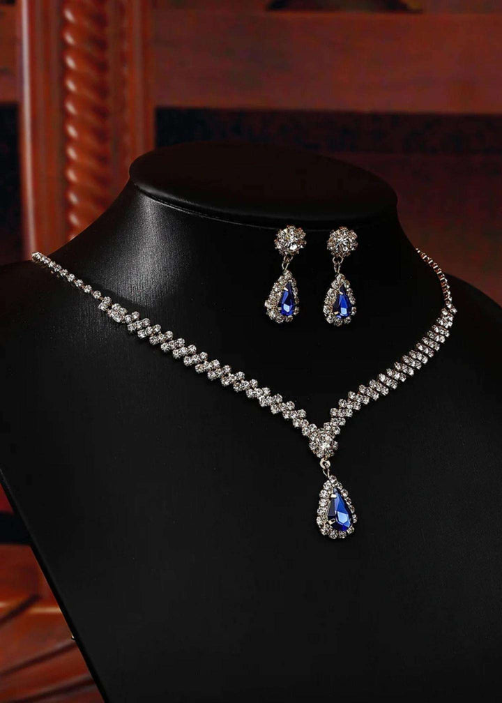 “Elevate your style with the blue teardrop crystal jewelry set with sparkling silver rhinestone necklace and earrings. Featuring hypoallergenic, skin-friendly materials and a trendy yet timeless design, this set is perfect for weddings, engagements, or daily glamour. Lightweight and affordable, it’s the ultimate accessory for every occasion. Treat yourself to luxury with Pablo Mode.”