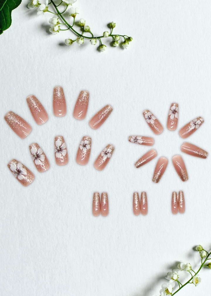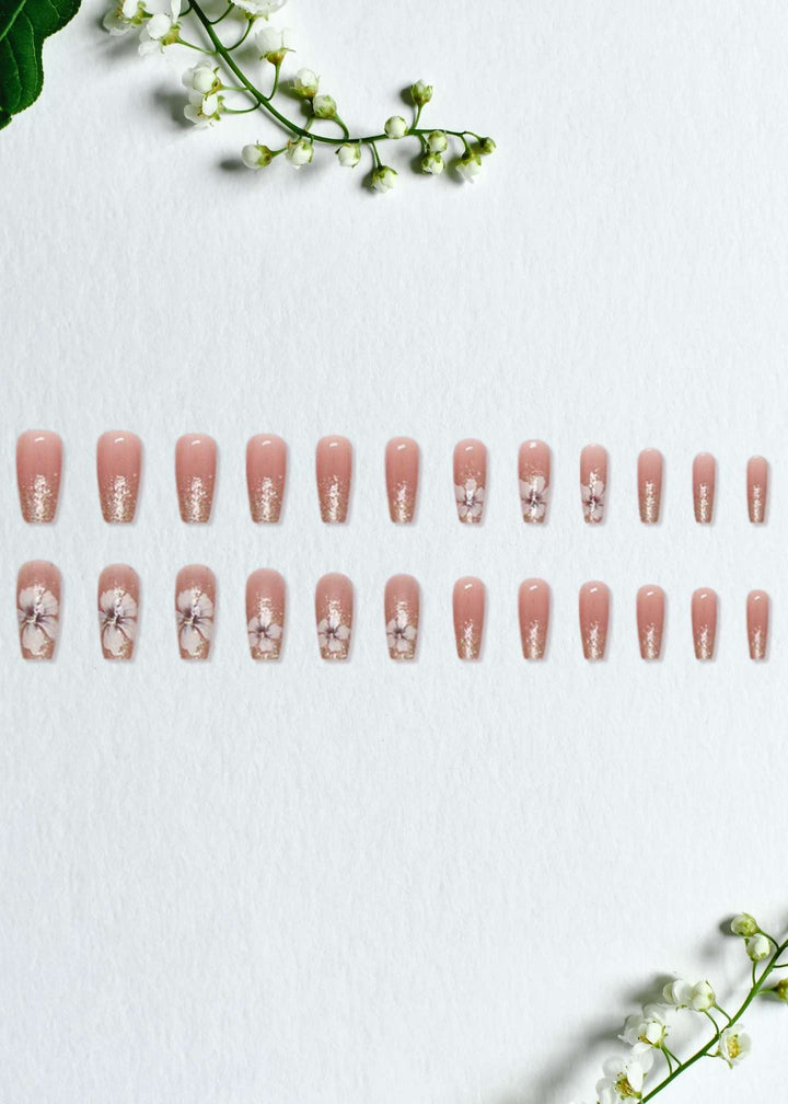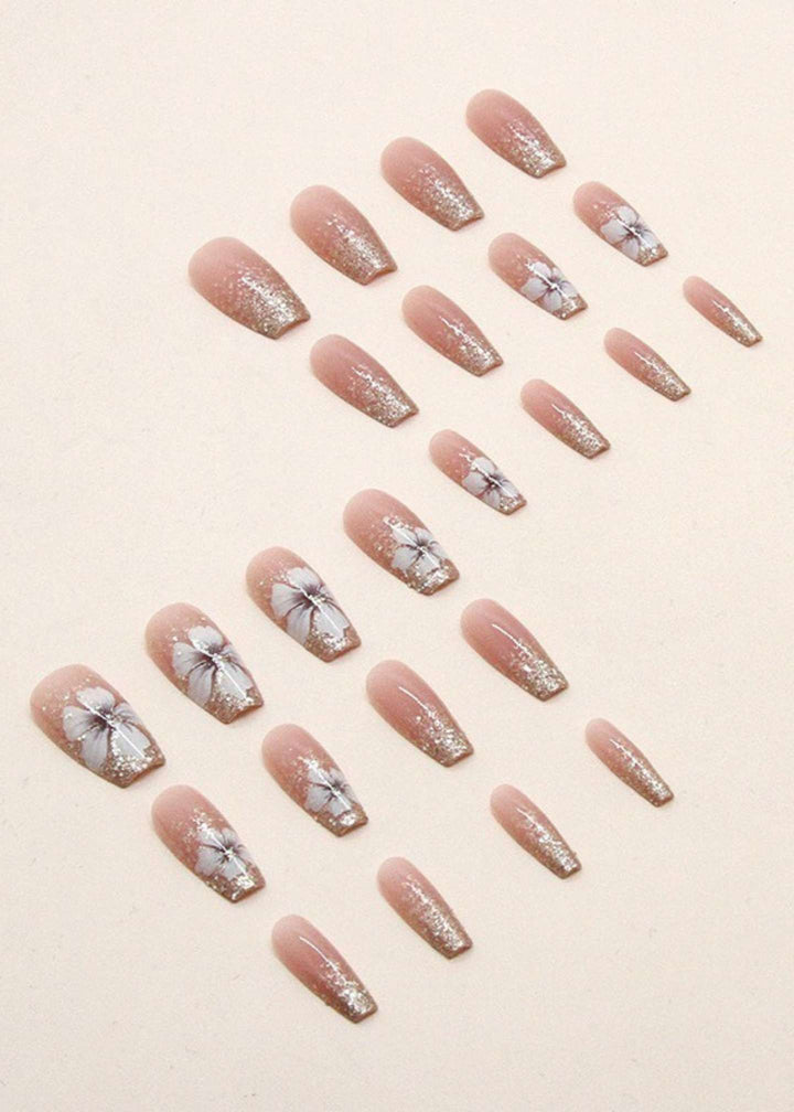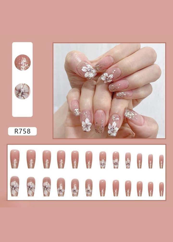 Experience stunning nail art with a parlor-perfect finish at home using these 24 mid-length press-ons featuring sparkling white camellias and glitter French tips, exclusively at Pablo Mode PK.